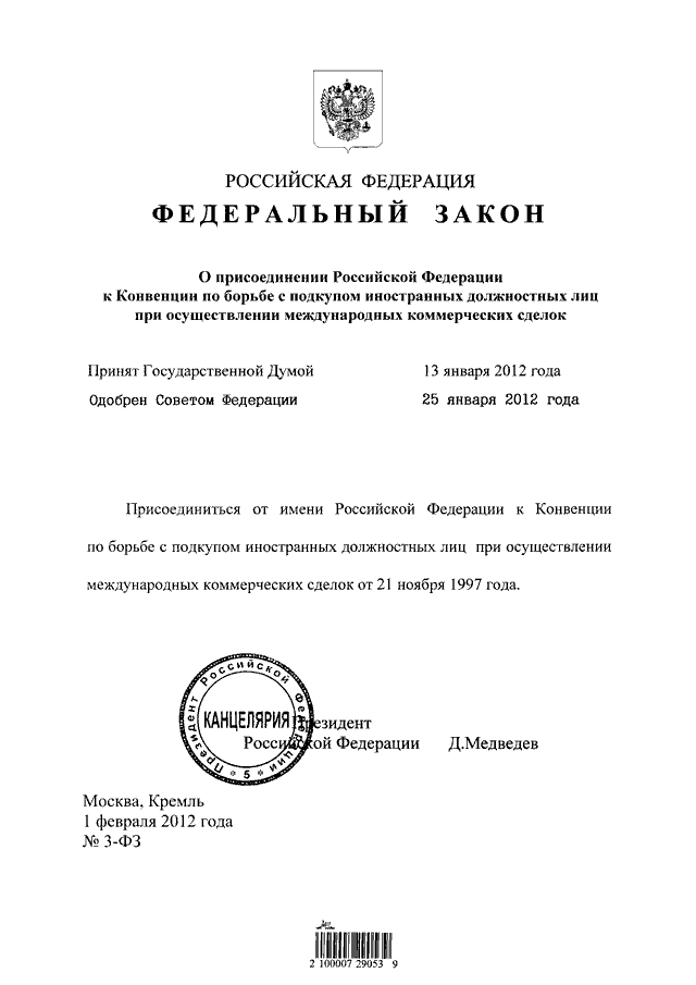 "О присоединении Российской Федерации к Конвенции по борьбе с подкупом иностранных должностных лиц при осуществлении международных коммерческих сделок"