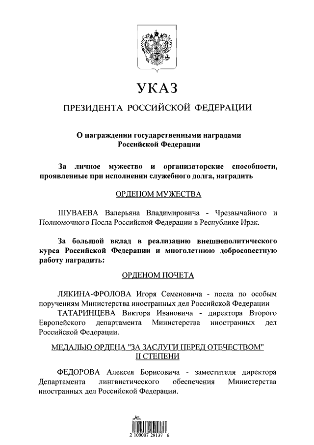 "О награждении государственными наградами Российской Федерации"