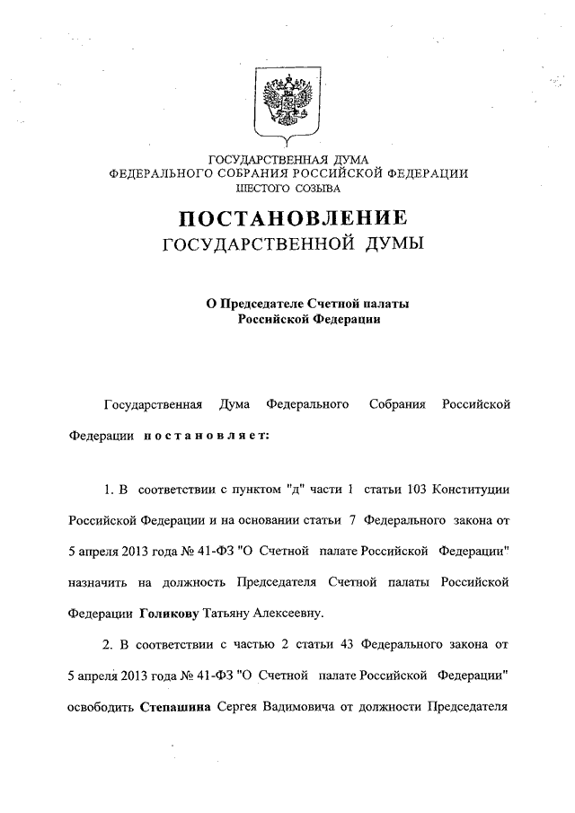 "О Председателе Счетной палаты Российской Федерации"