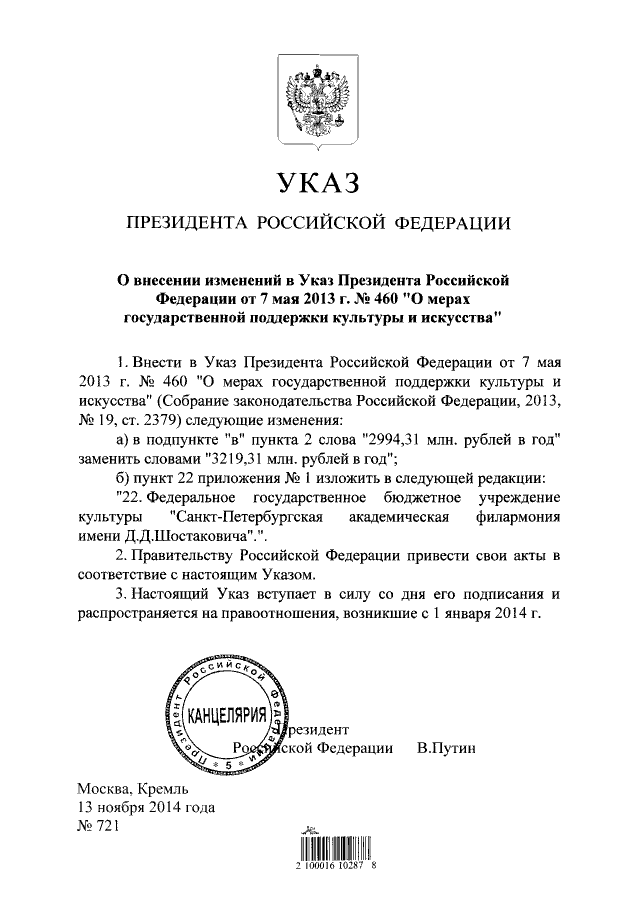 Указ Президента Российской Федерации от 13.11.2014 № 721