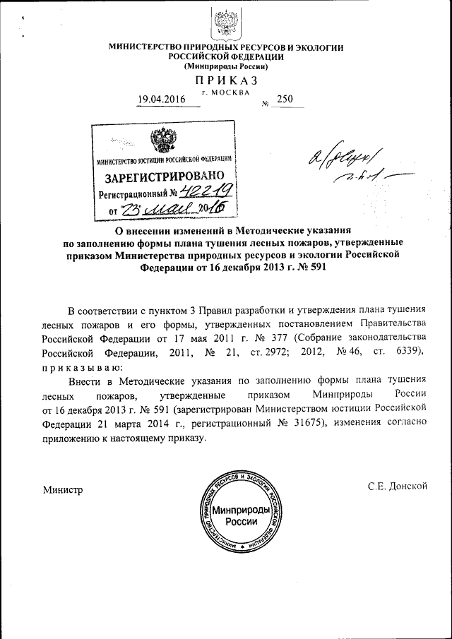 "О внесении изменений в Методические указания по заполнению формы плана тушения лесных пожаров, утвержденные приказом Министерства природных ресурсов и экологии Российской Федерации от 16 декабря 2013 г. № 591"