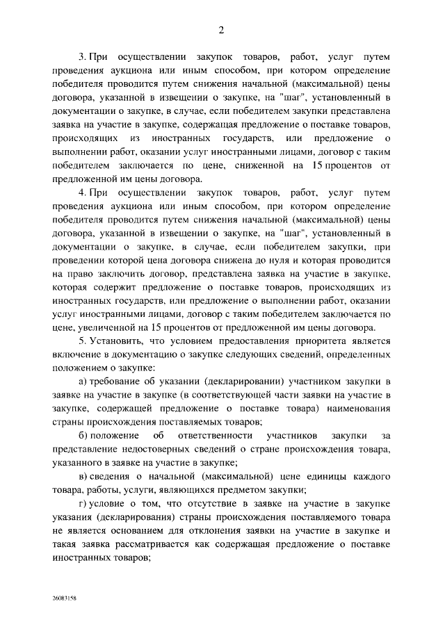 "О приоритете товаров российского происхождения, работ, услуг, выполняемых, оказываемых российскими лицами, по отношению к товарам, происходящим из иностранного государства, работам, услугам, выполняемым, оказываемым иностранными лицами"