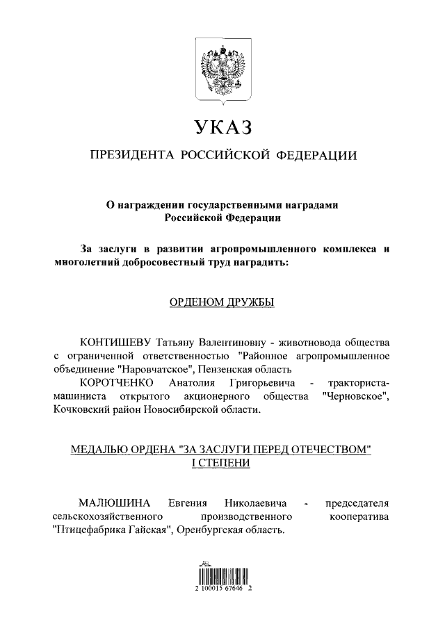 "О награждении государственными наградами Российской Федерации"