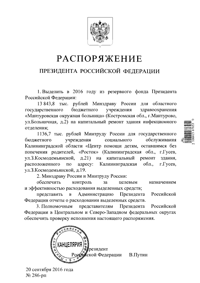 Распоряжение Президента Российской Федерации от 20.09.2016 № 286-рп