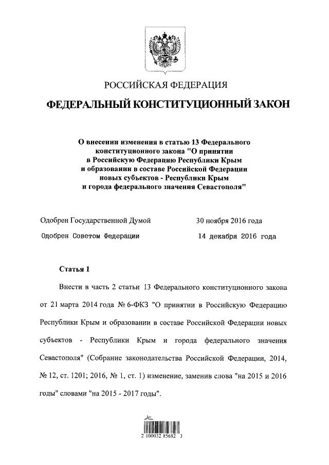 "О внесении изменения в статью 13 Федерального конституционного закона "О принятии в Российскую Федерацию Республики Крым и образовании в составе Российской Федерации новых субъектов - Республики Крым и города федерального значения Севастополя"
