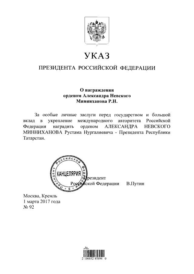 Указ Президента Российской Федерации от 01.03.2017 № 92