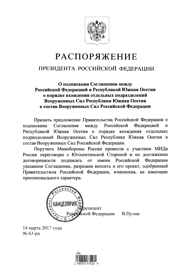 "О подписании Соглашения между Российской Федерацией и Республикой Южная Осетия о порядке вхождения отдельных подразделений Вооруженных Сил Республики Южная Осетия в состав Вооруженных Сил Российской Федерации"