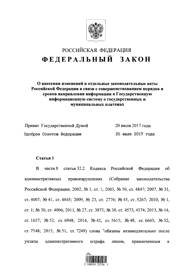 "О внесении изменений в отдельные законодательные акты Российской Федерации в связи с совершенствованием порядка и сроков направления информации в Государственную информационную систему о государственных и муниципальных платежах"