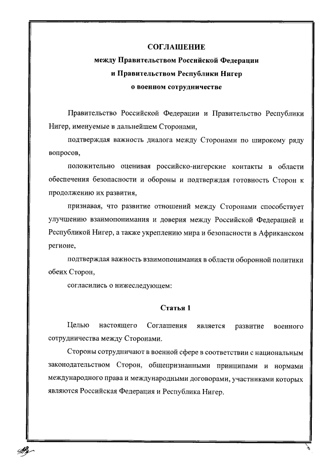 Соглашение между Правительством Российской Федерации и Правительством Республики Нигер о военном сотрудничестве от 22 августа 2017 года
