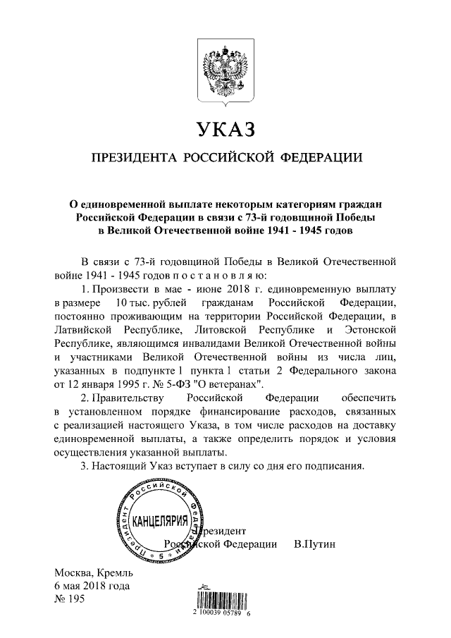 Указ Президента Российской Федерации от 06.05.2018 № 195