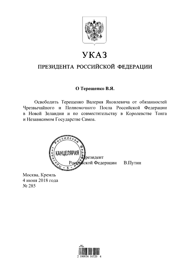 Указ Президента Российской Федерации от 04.06.2018 № 285
