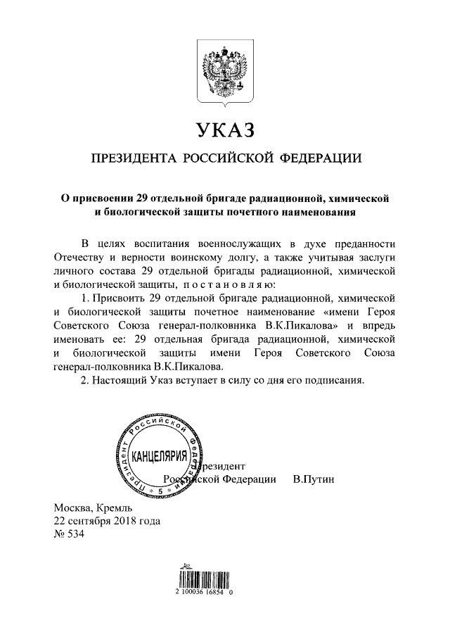Указ Президента Российской Федерации от 22.09.2018 № 534