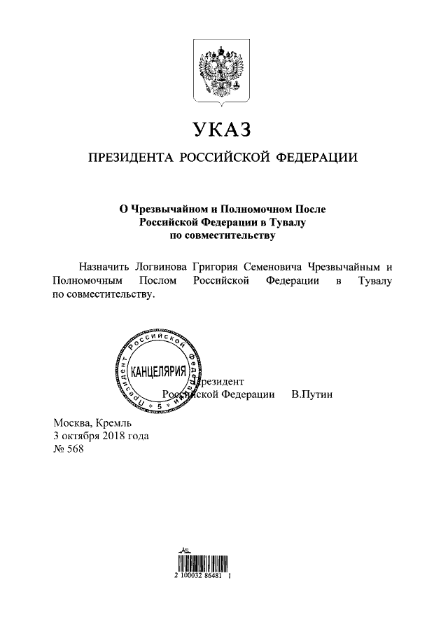 Указ Президента Российской Федерации от 03.10.2018 № 568