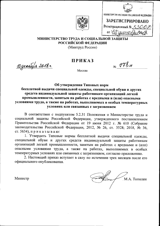 Приказ Министерства труда и социальной защиты Российской Федерации от 10.12.2018 № 778н