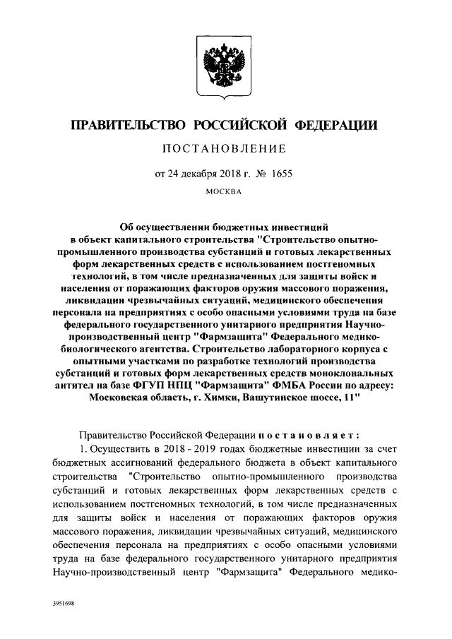 "Об осуществлении бюджетных инвестиций в объект капитального строительства "Строительство опытно-промышленного производства субстанций и готовых лекарственных форм лекарственных средств с использованием постгеномных технологий, в том числе предназначенных для защиты войск и населения от поражающих факторов оружия массового поражения, ликвидации чрезвычайных ситуаций, медицинского обеспечения персонала на предприятиях с особо опасными условиями труда на базе федерального государственного унитарного предприятия Научно-производственный центр "Фармзащита" Федерального медико-биологического агентства. Строительство лабораторного корпуса с опытными участками по разработке технологий производства субстанций и готовых форм лекарственных средств моноклональных антител на базе ФГУП НПЦ "Фармзащита" ФМБА России по адресу: Московская область, г. Химки, Вашутинское шоссе, 11"