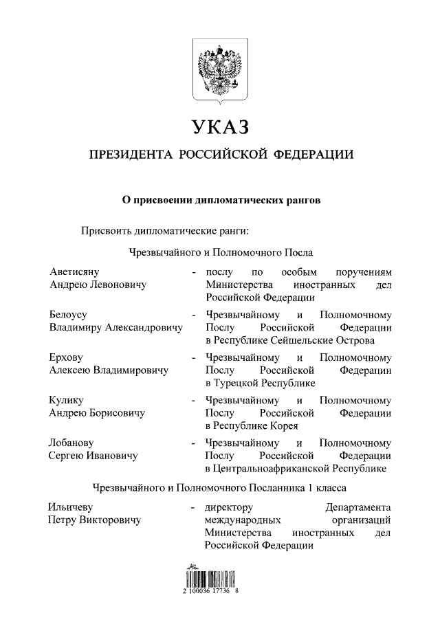 "О присвоении дипломатических рангов"