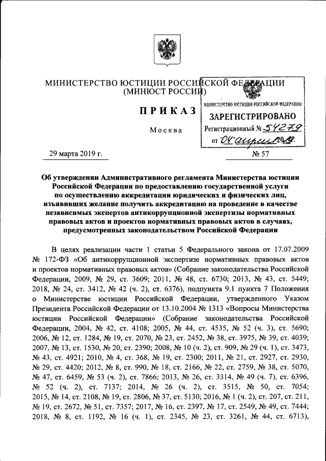 Приказ Министерства юстиции Российской Федерации от 29.03.2019 № 57
