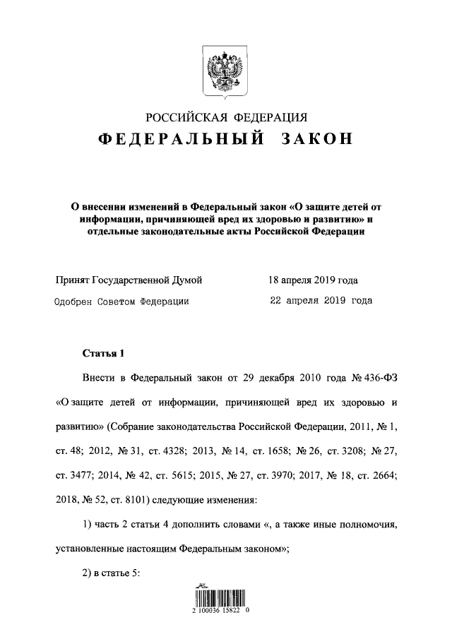 "О внесении изменений в Федеральный закон "О защите детей от информации, причиняющей вред их здоровью и развитию" и отдельные законодательные акты Российской Федерации"