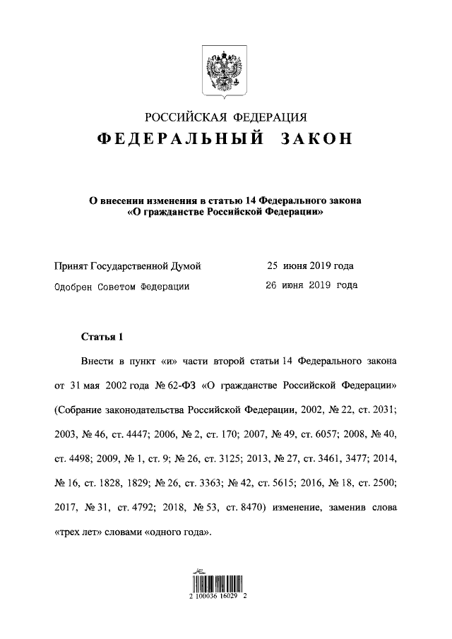 "О внесении изменения в статью 14 Федерального закона "О гражданстве Российской Федерации"