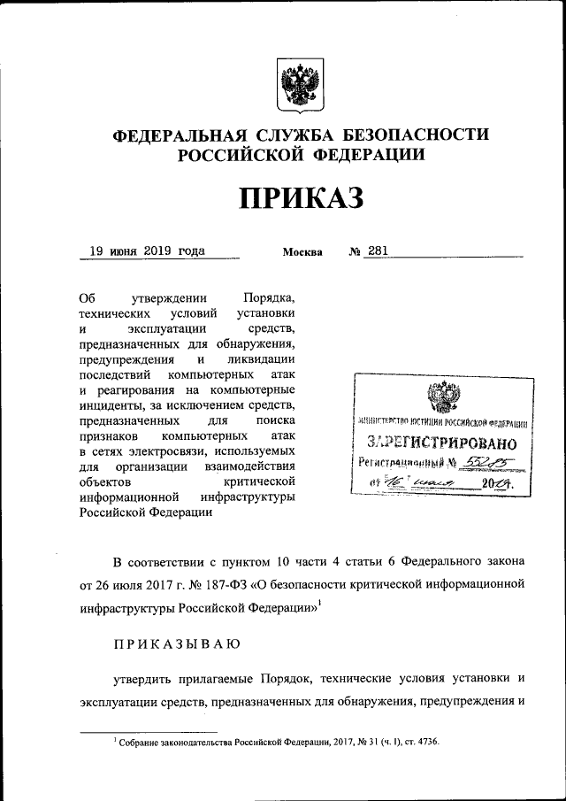Приказ Федеральной службы безопасности Российской Федерации от 19.06.2019 № 281