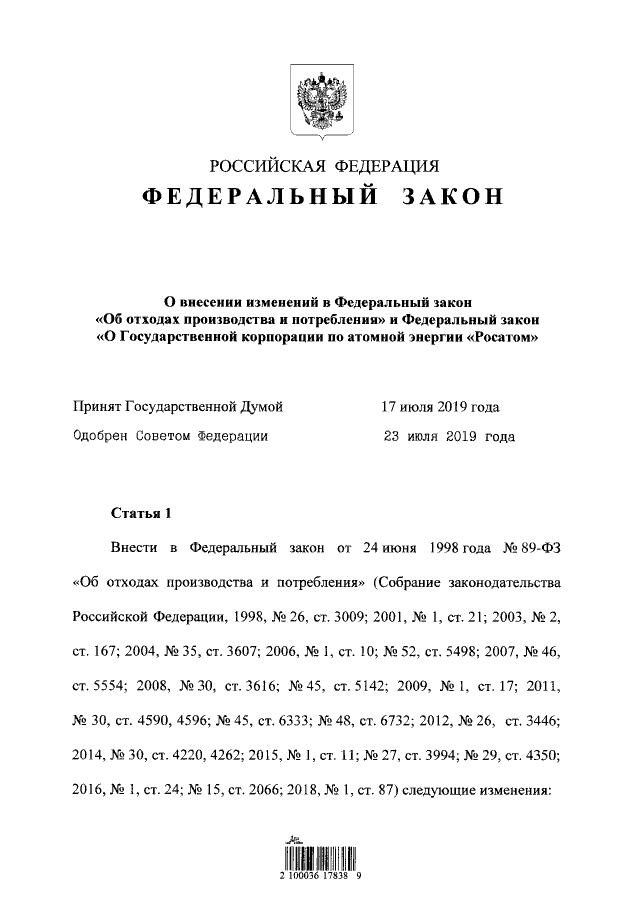 "О внесении изменений в Федеральный закон "Об отходах производства и потребления" и Федеральный закон "О Государственной корпорации по атомной энергии "Росатом"