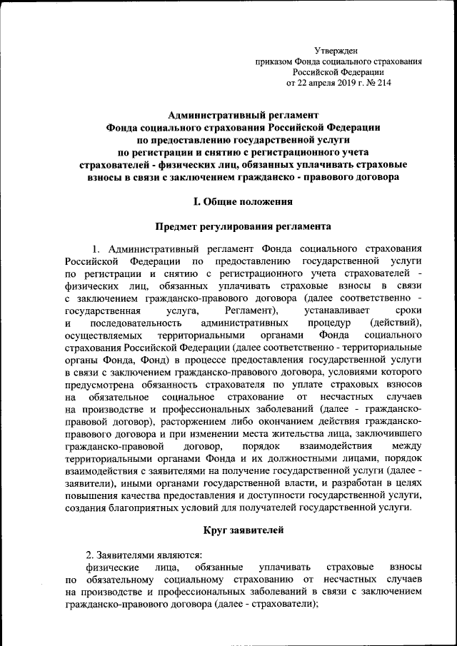 Приказ Фонда социального страхования Российской Федерации от 22.04.2019 № 214