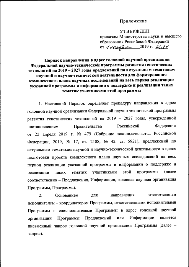Приказ Министерства науки и высшего образования Российской Федерации от 01.11.2019 № 1224
