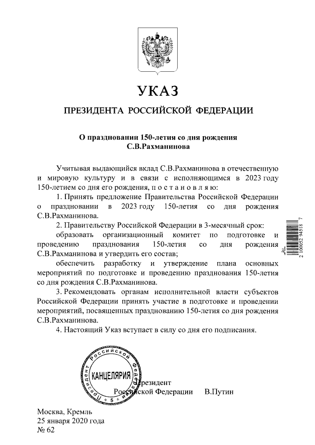 Указ Президента Российской Федерации от 25.01.2020 № 62