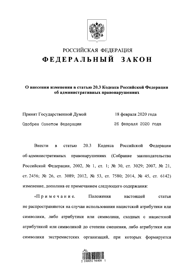 "О внесении изменения в статью 20.3 Кодекса Российской Федерации об административных правонарушениях"