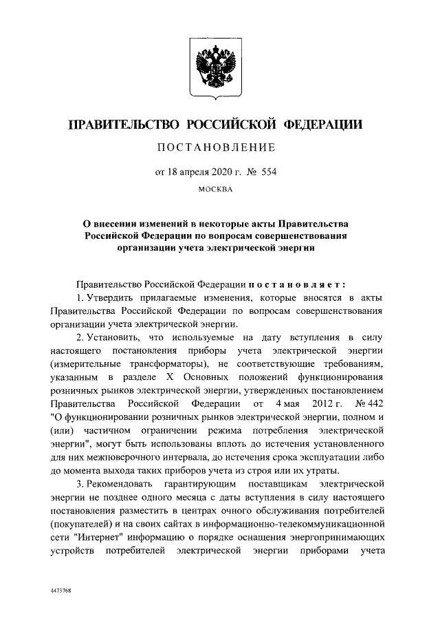Постановление Правительства Российской Федерации от 18.04.2020 № 554