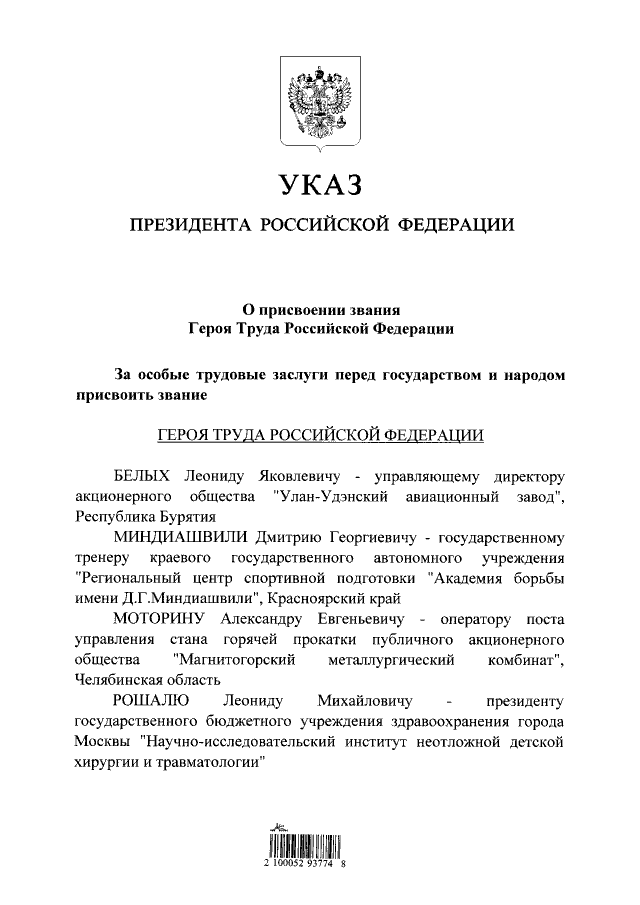 "О присвоении звания Героя Труда Российской Федерации"