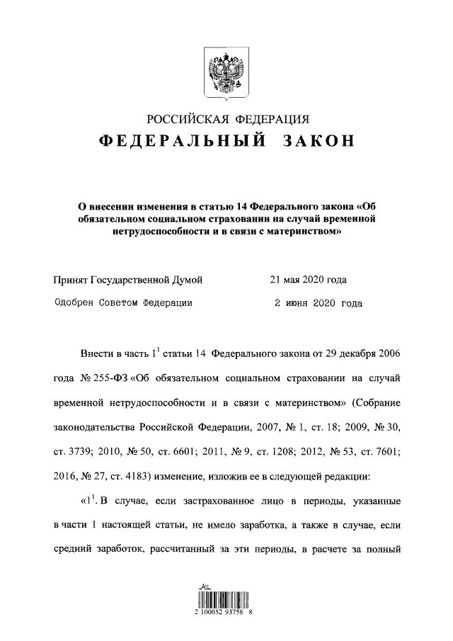 "О внесении изменения в статью 14 Федерального закона "Об обязательном социальном страховании на случай временной нетрудоспособности и в связи с материнством"