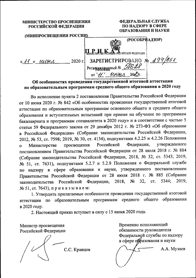 Приказ Министерства просвещения Российской Федерации, Федеральной службы по надзору в сфере образования и науки от 11.06.2020 № 294/651