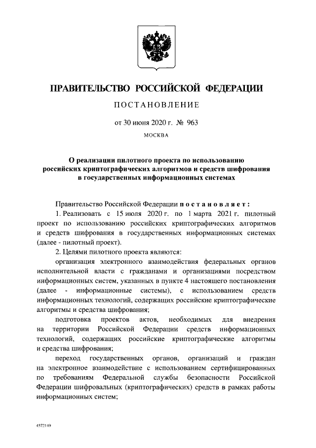 "О реализации пилотного проекта по использованию российских криптографических алгоритмов и средств шифрования в государственных информационных системах"