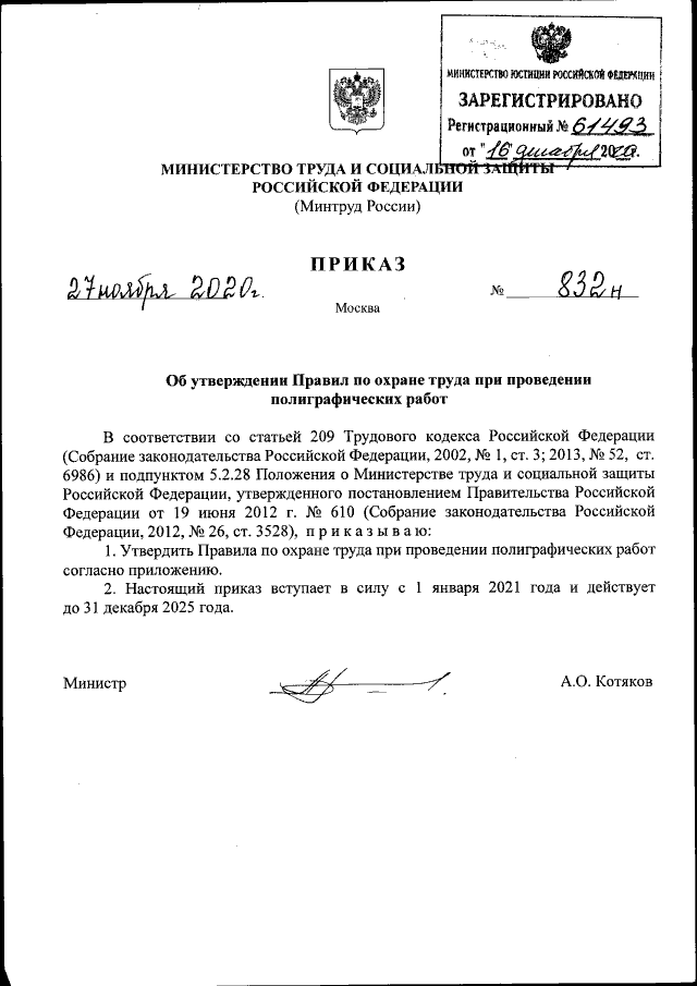 Приказ Министерства труда и социальной защиты Российской Федерации от 27.11.2020 № 832н