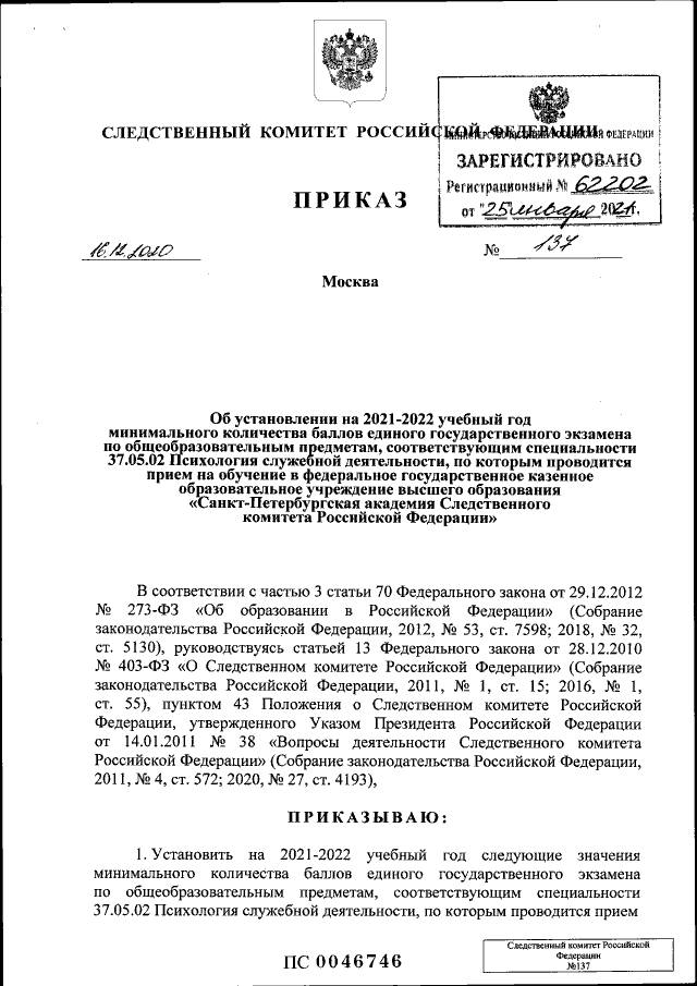 Приказ Следственного комитета Российской Федерации от 16.12.2020 № 137
