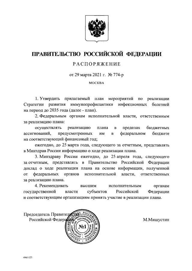 Распоряжение Правительства Российской Федерации от 29.03.2021 № 774-р