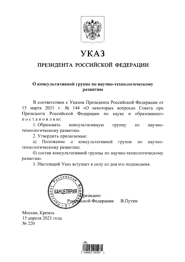 Указ Президента Российской Федерации от 15.04.2021 № 220