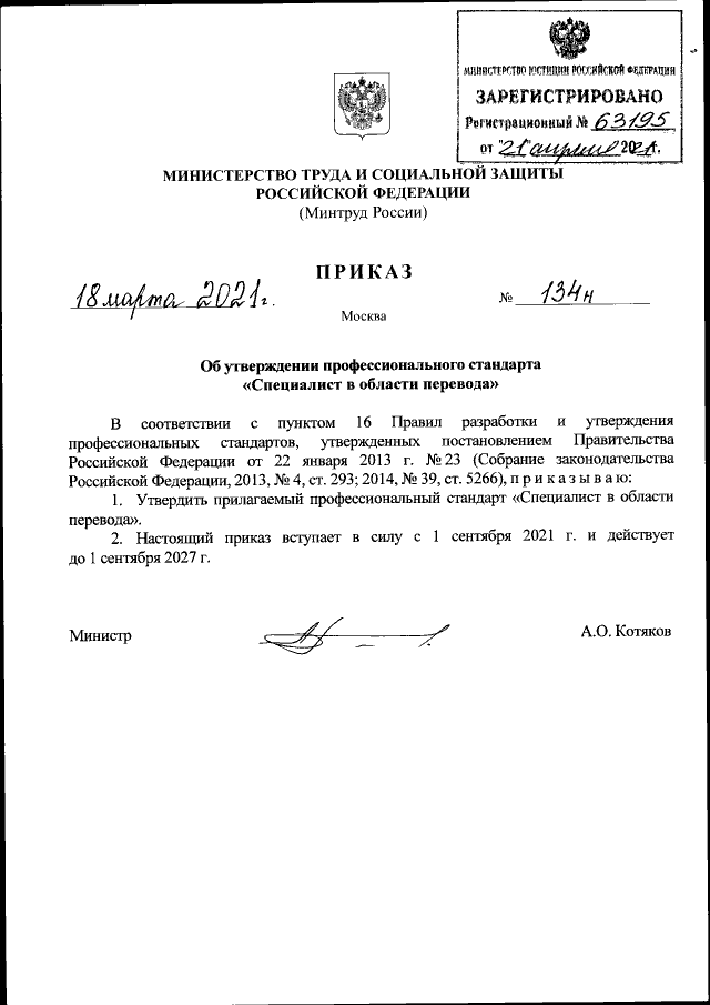 Приказ Министерства труда и социальной защиты Российской Федерации от 18.03.2021 № 134н