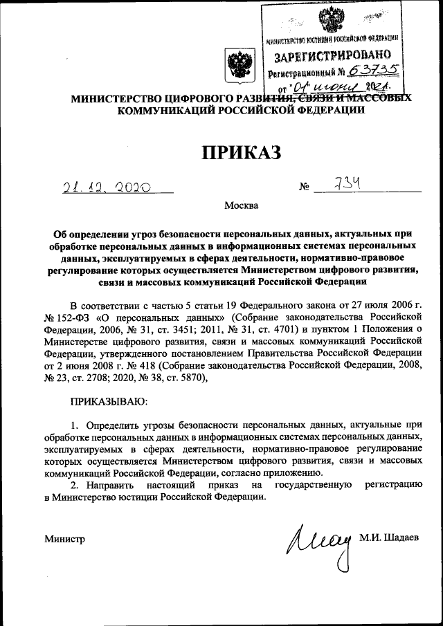 Приказ Министерства цифрового развития, связи и массовых коммуникаций Российской Федерации от 21.12.2020 № 734