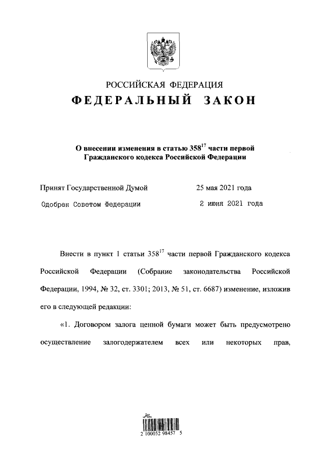 "О внесении изменения в статью 358-17 части первой Гражданского кодекса Российской Федерации"