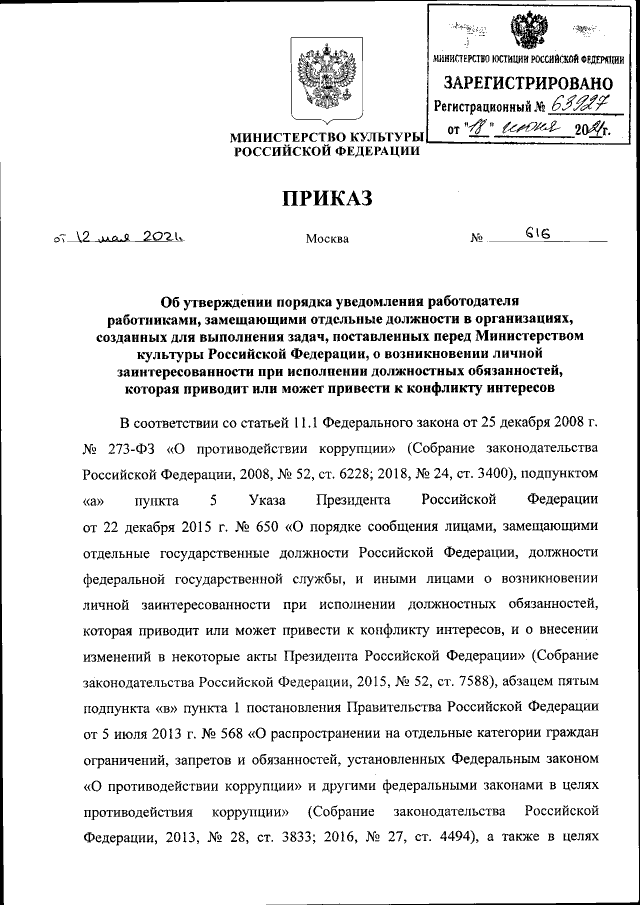 Приказ Министерства культуры Российской Федерации от 12.05.2021 № 616