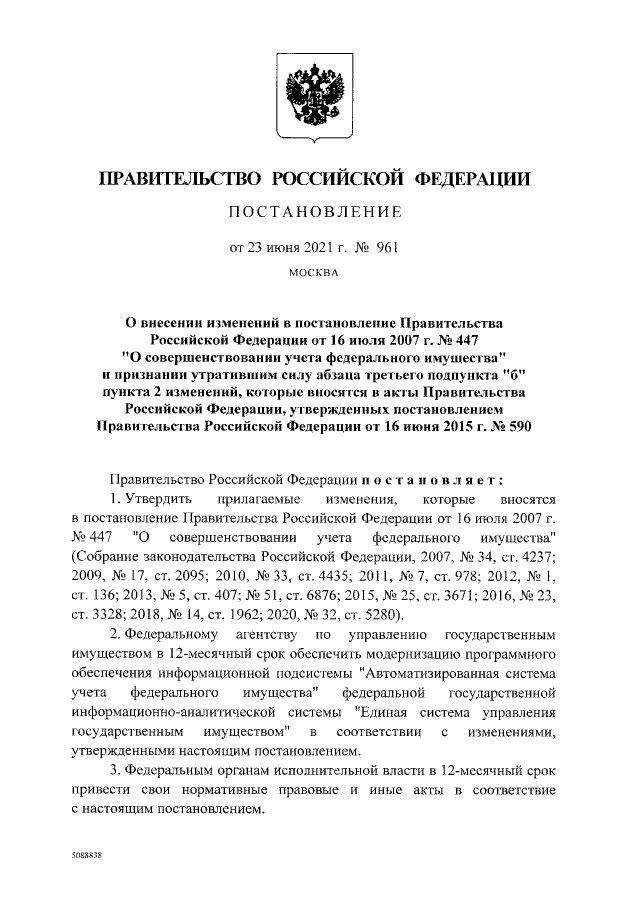 "О внесении изменений в постановление Правительства Российской Федерации от 16 июля 2007 г. № 447 "О совершенствовании учета федерального имущества" и признании утратившим силу абзаца третьего подпункта "б" пункта 2 изменений, которые вносятся в акты Правительства Российской Федерации, утвержденных постановлением Правительства Российской Федерации от 16 июня 2015 г. № 590"