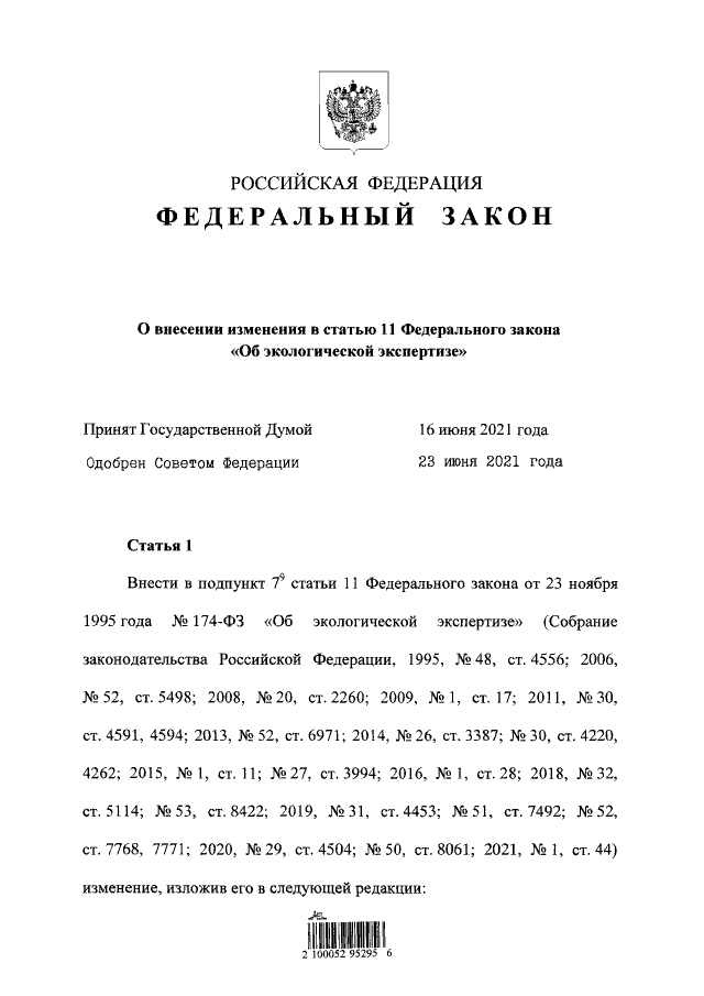 "О внесении изменения в статью 11 Федерального закона "Об экологической экспертизе"
