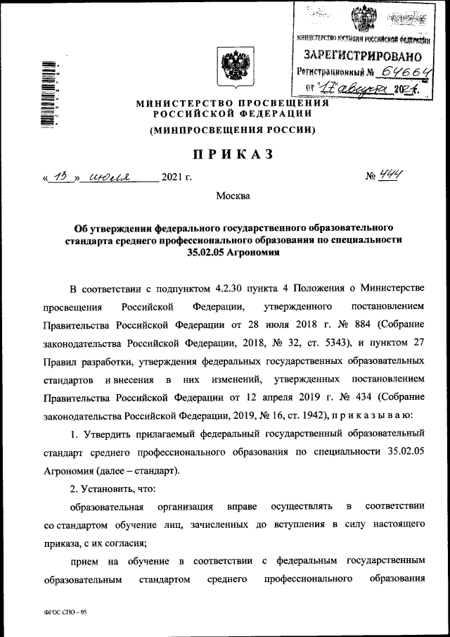"Об утверждении федерального государственного образовательного стандарта среднего профессионального образования по специальности 35.02.05 Агрономия"