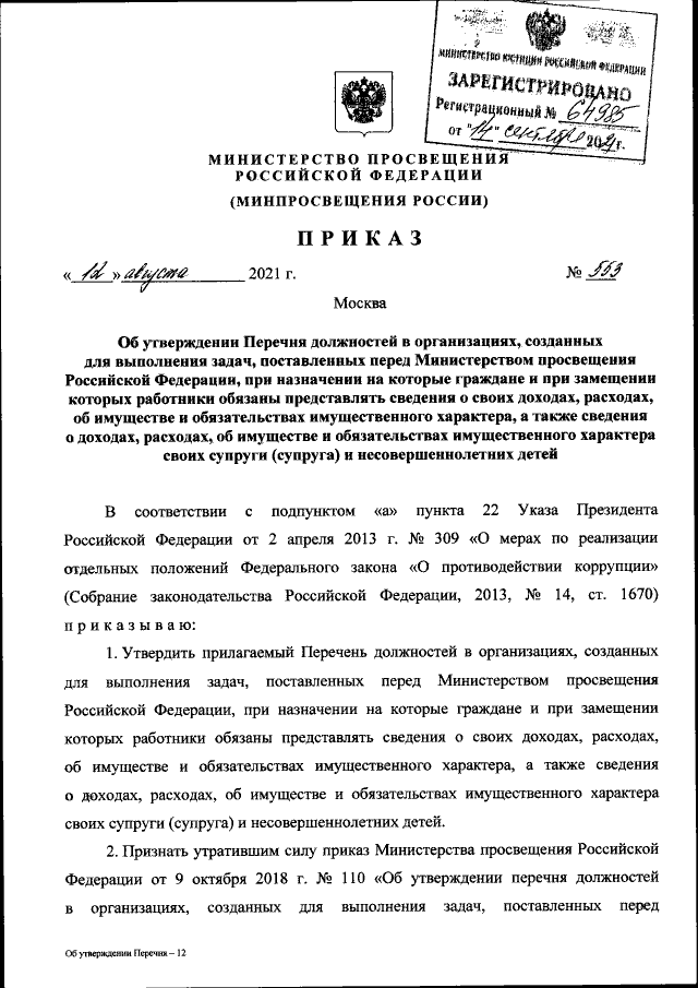 Приказ Министерства просвещения Российской Федерации от 12.08.2021 № 553