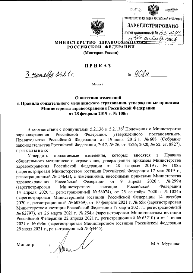 Приказ Министерства здравоохранения Российской Федерации от 03.09.2021 № 908н