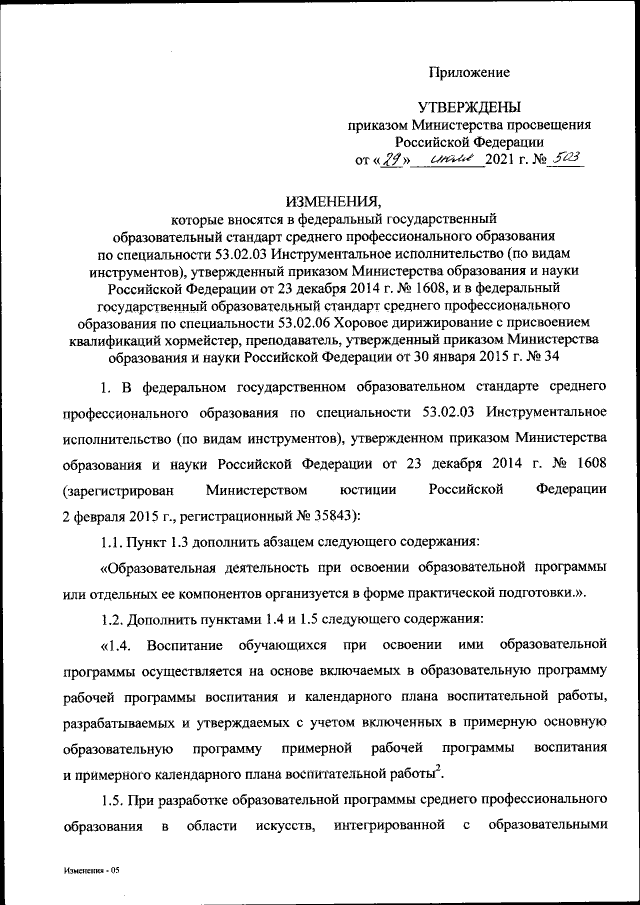 "О внесении изменений в федеральный государственный образовательный стандарт среднего профессионального образования по специальности 53.02.03 Инструментальное исполнительство (по видам инструментов), утвержденный приказом Министерства образования и науки Российской Федерации от 23 декабря 2014 г. № 1608, и в федеральный государственный образовательный стандарт среднего профессионального образования по специальности 53.02.06 Хоровое дирижирование с присвоением квалификаций хормейстер, преподаватель, утвержденный приказом Министерства образования и науки Российской Федерации от 30 января 2015 г. № 34"