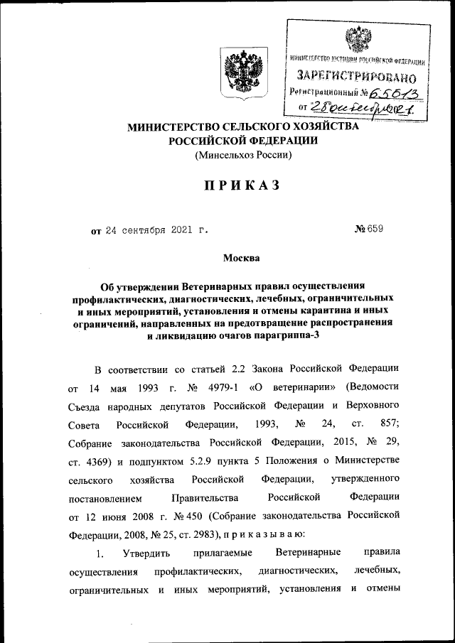 Приказ Министерства сельского хозяйства Российской Федерации от 24.09.2021 № 659