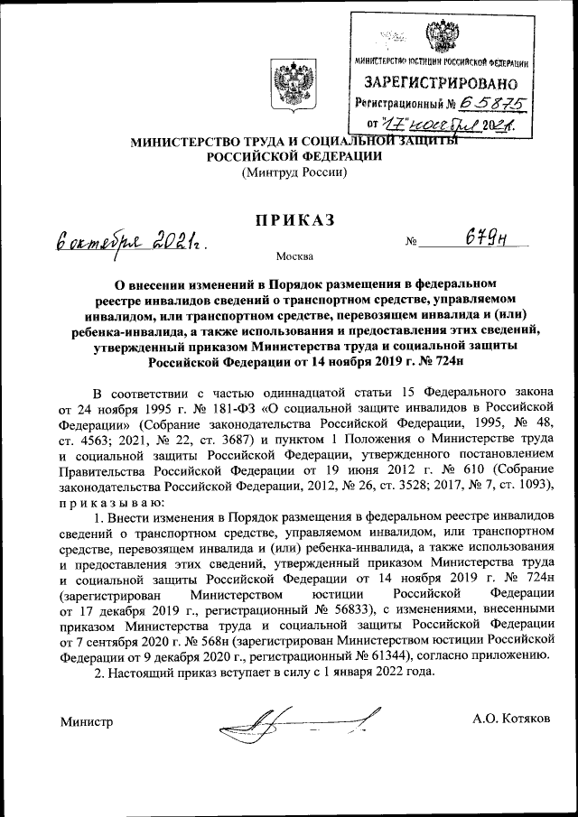 "О внесении изменений в Порядок размещения в федеральном реестре инвалидов сведений о транспортном средстве, управляемом инвалидом, или транспортном средстве, перевозящем инвалида и (или) ребенка-инвалида, а также использования и предоставления этих сведений, утвержденный приказом Министерства труда и социальной защиты Российской Федерации от 14 ноября 2019 г. № 724н"